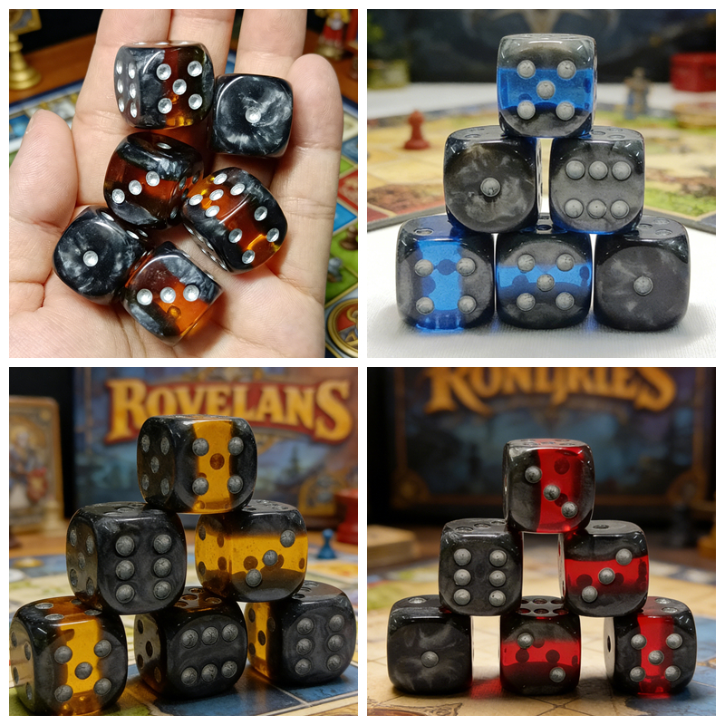 The dice come in four styles: Pearl Black with Yellow Layer, Pearl Black with Orange Layer, Pearl Black with Red Layer, and Pearl Black with Blue Layer.